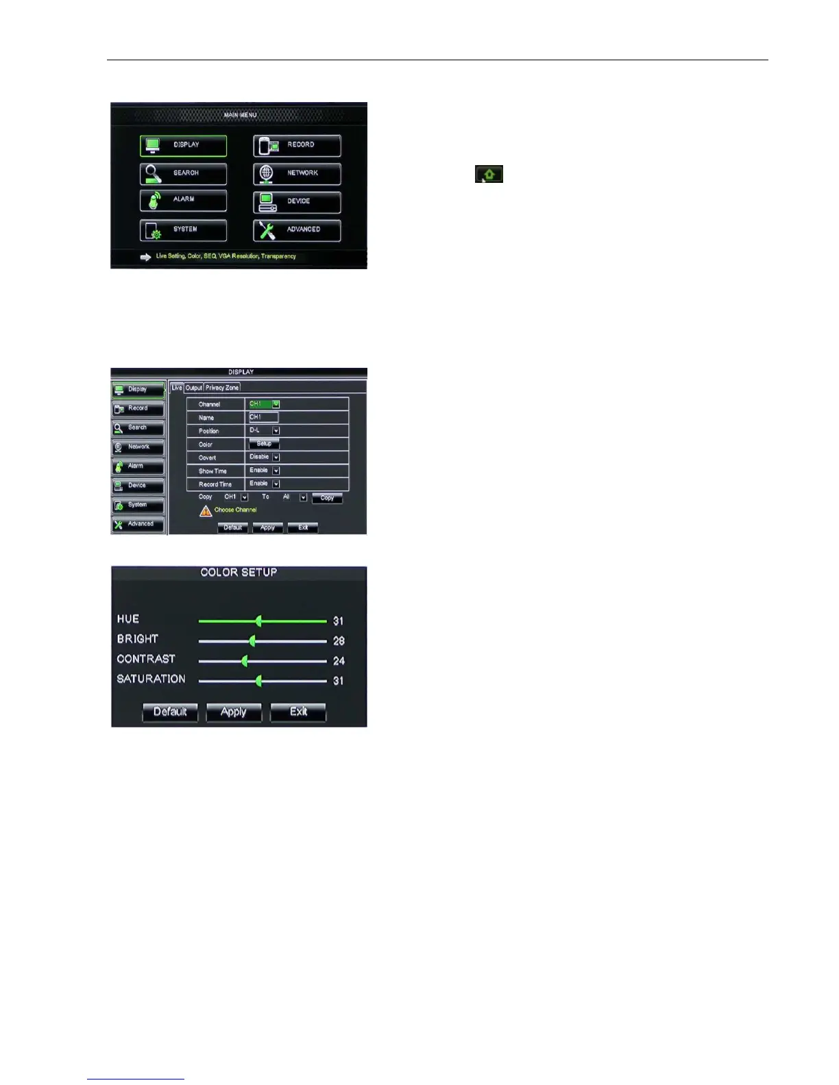 Go to <Main menuDisplayLive> option and enter into the <Display> setting interface shown as