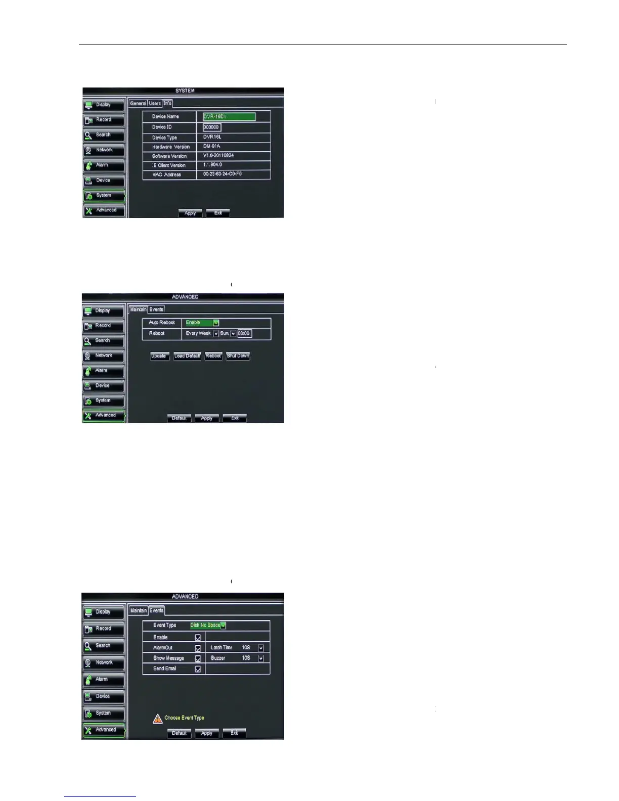 Disk No Space, Disk Error and Video Loss.