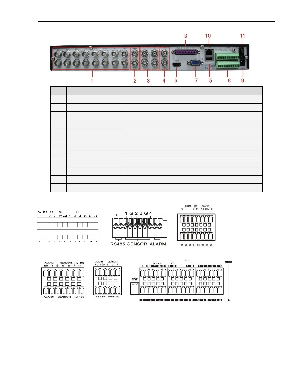 RS485/Sensor/Alarm port functions: