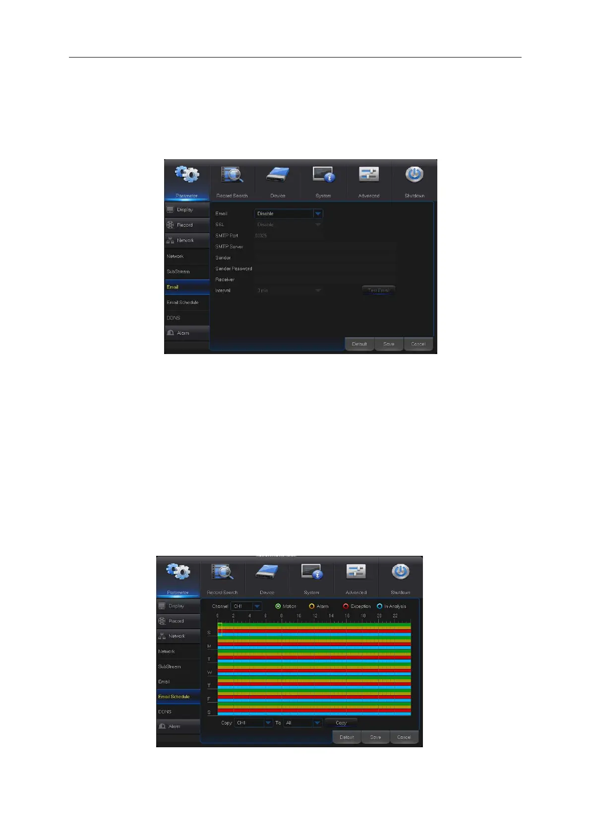 Go to “Main Menu” → “Parameter” → “Network” → “Email” to enter into the menu interface.