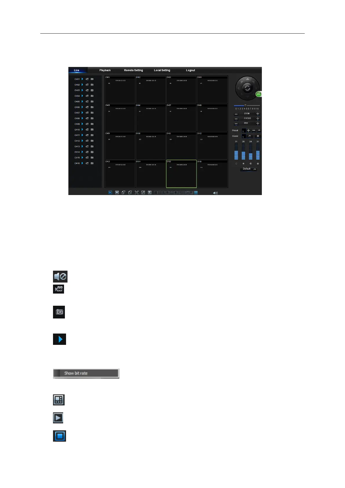 shown as Picture 6-3. You can click [Play] button to Open/close live images, on-spot record,