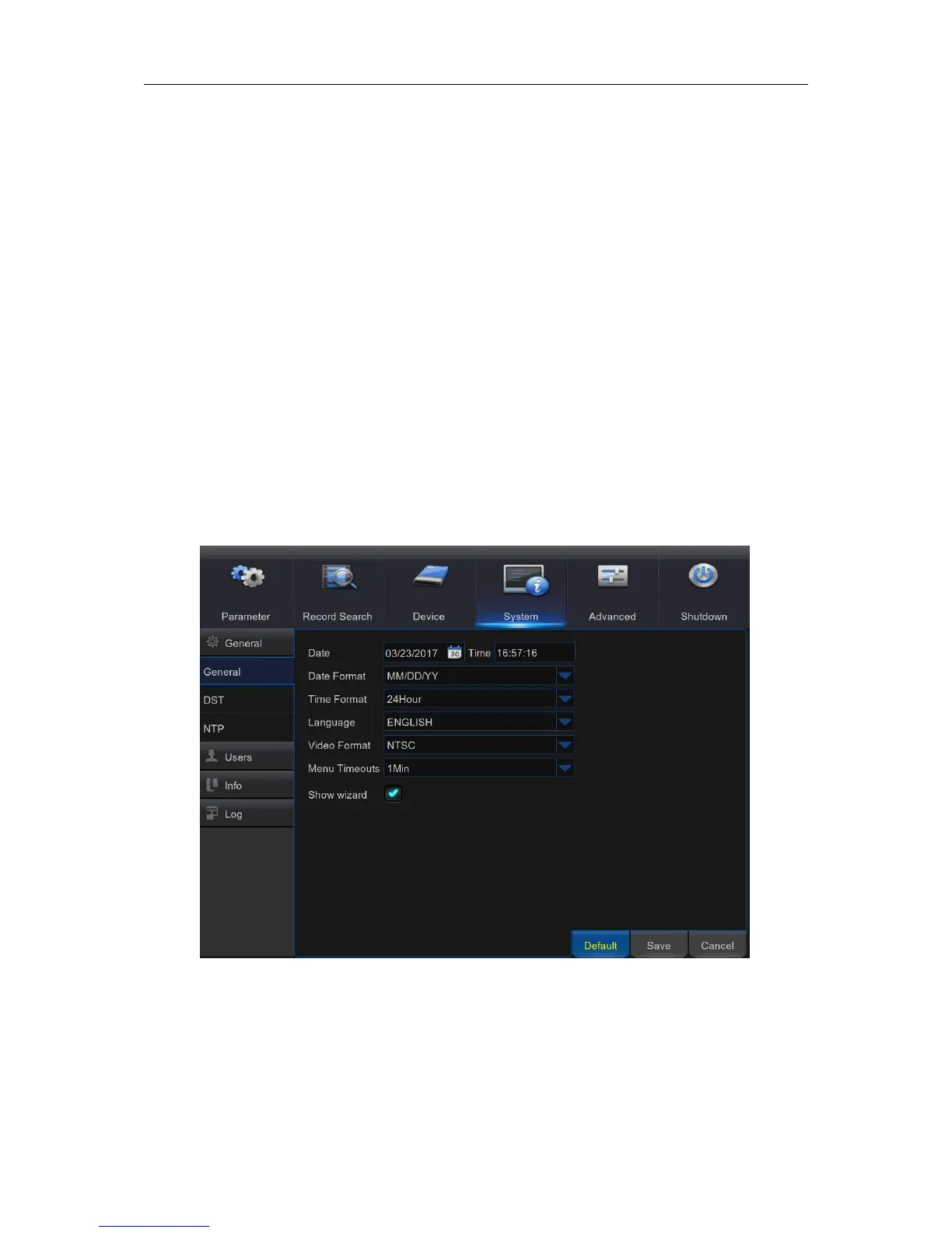 language, menu timeouts, DST, NTP, User Management, check system information & system log