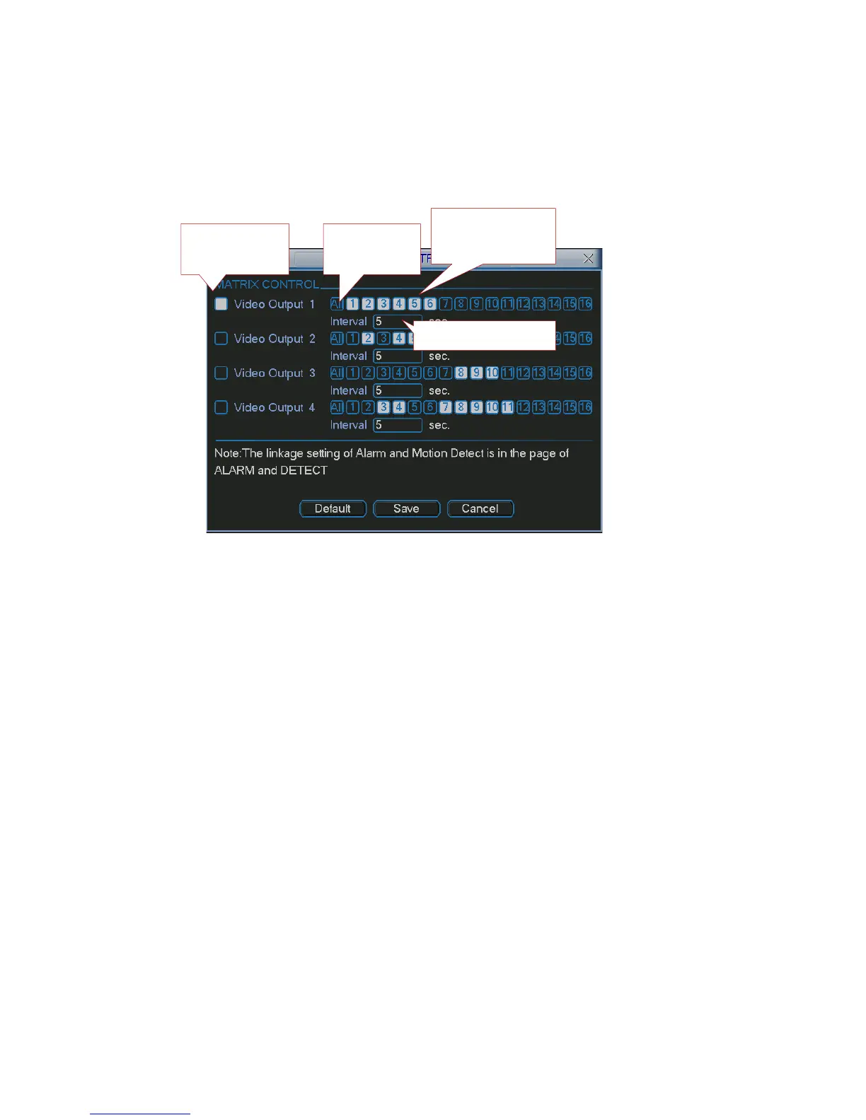 matrix function and then select vide output channel. Once the alarm occurs, system