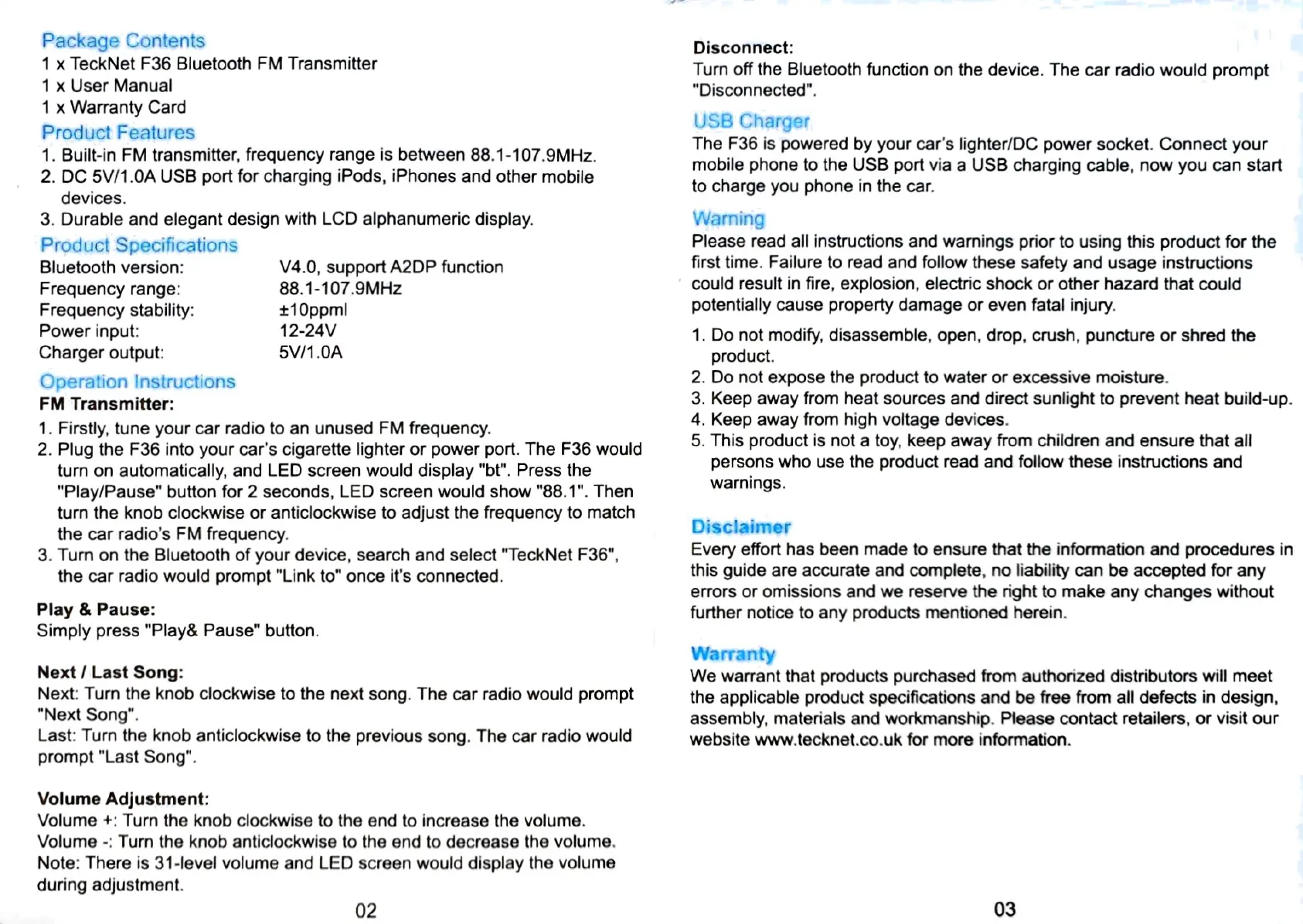 Tecknet F36 - Operating Instructions; FM Transmitter Setup; Playback Controls; Disconnection Procedure