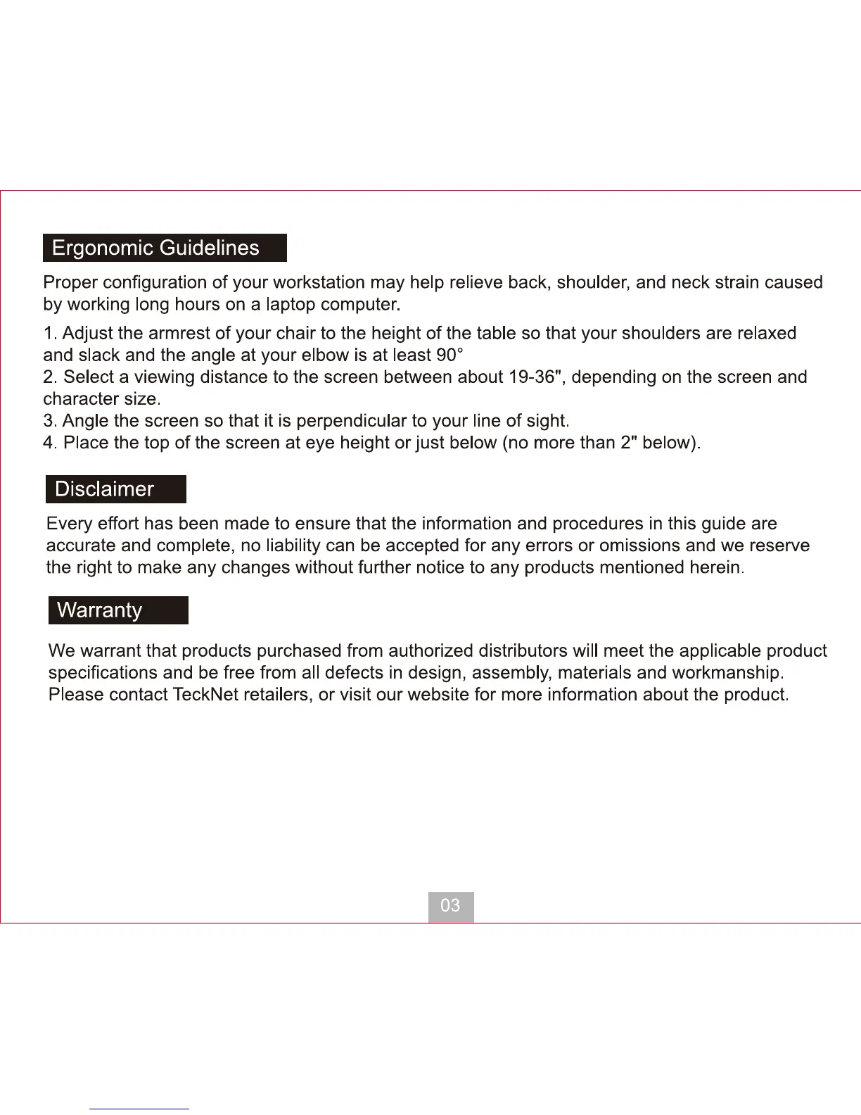 Tecknet N3 - Guidelines and Disclaimers; Ergonomic Guidelines; Disclaimer; Warranty