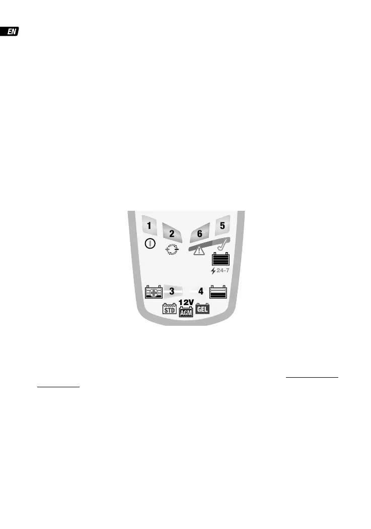 1. LED #1 - Power on. Confirms AC power supply to the charger. 2. LED #2 indicates inverse
