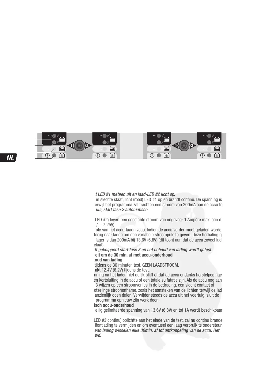 1.2 HERSTEL – bij verwaarloosde accu’s in slechte staat, licht (rood) LED #1 op en brandt continu. De spanning is