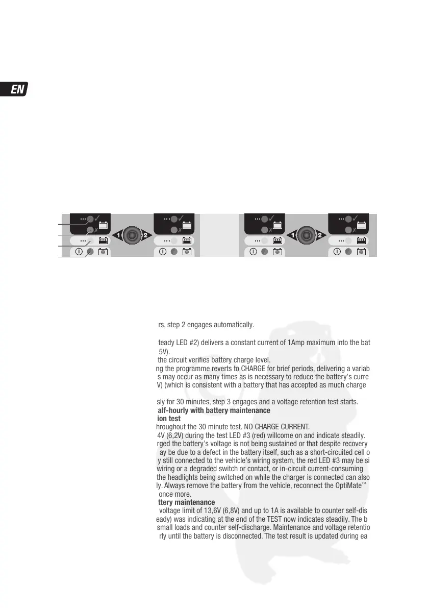 1.2 RECOVERY - For neglected batteries in poor state of health, LED #1 remains on (red) and indicates steadily. The charge