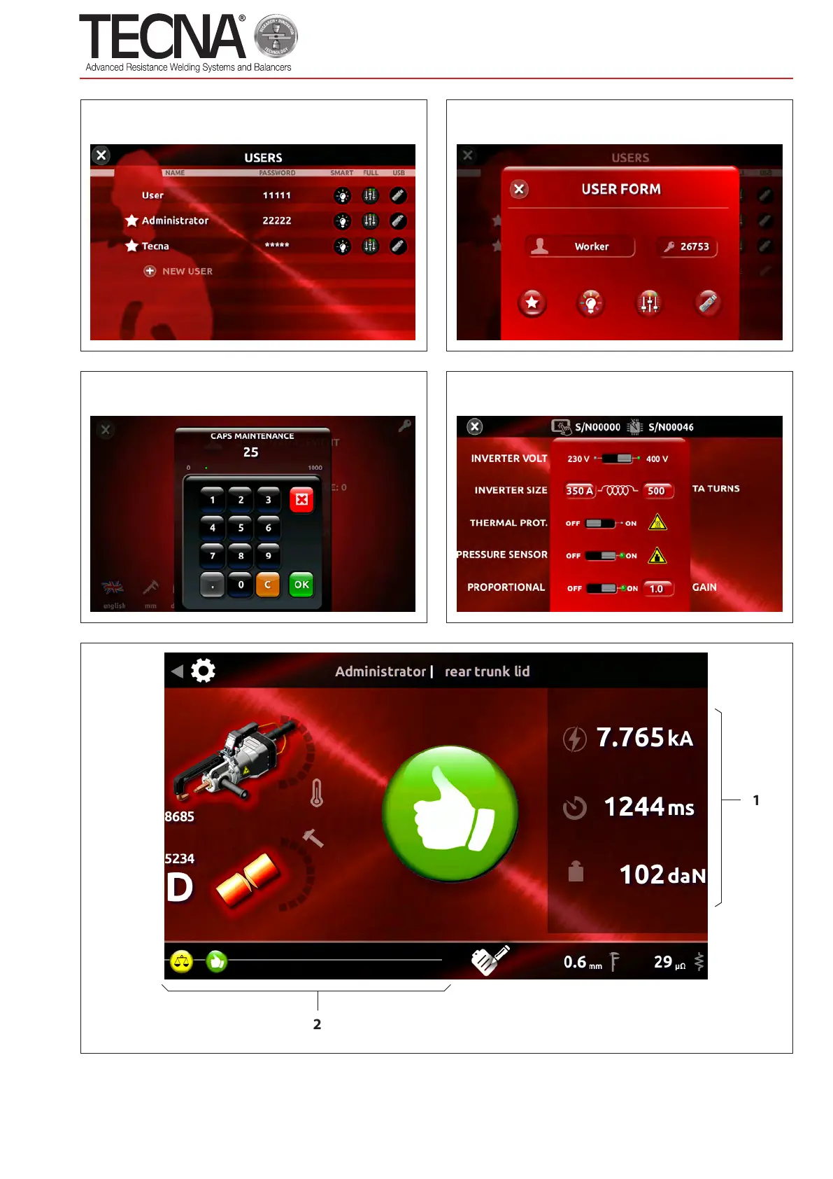 TECNA 3680 - Advanced Operator Interface Screens; User List and Profile Configuration Screens; Maintenance and System Settings Screen Views