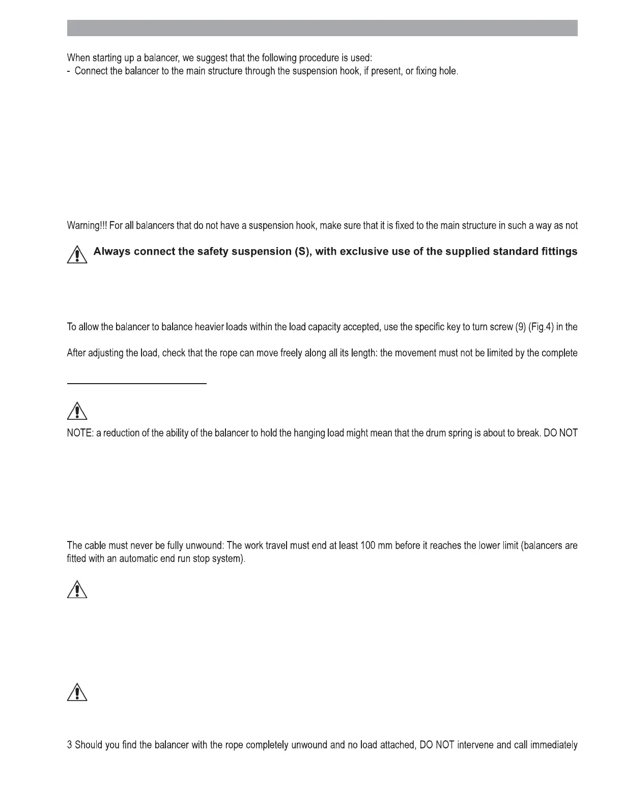 - Do not move the load by pulling the balancer’s rope;