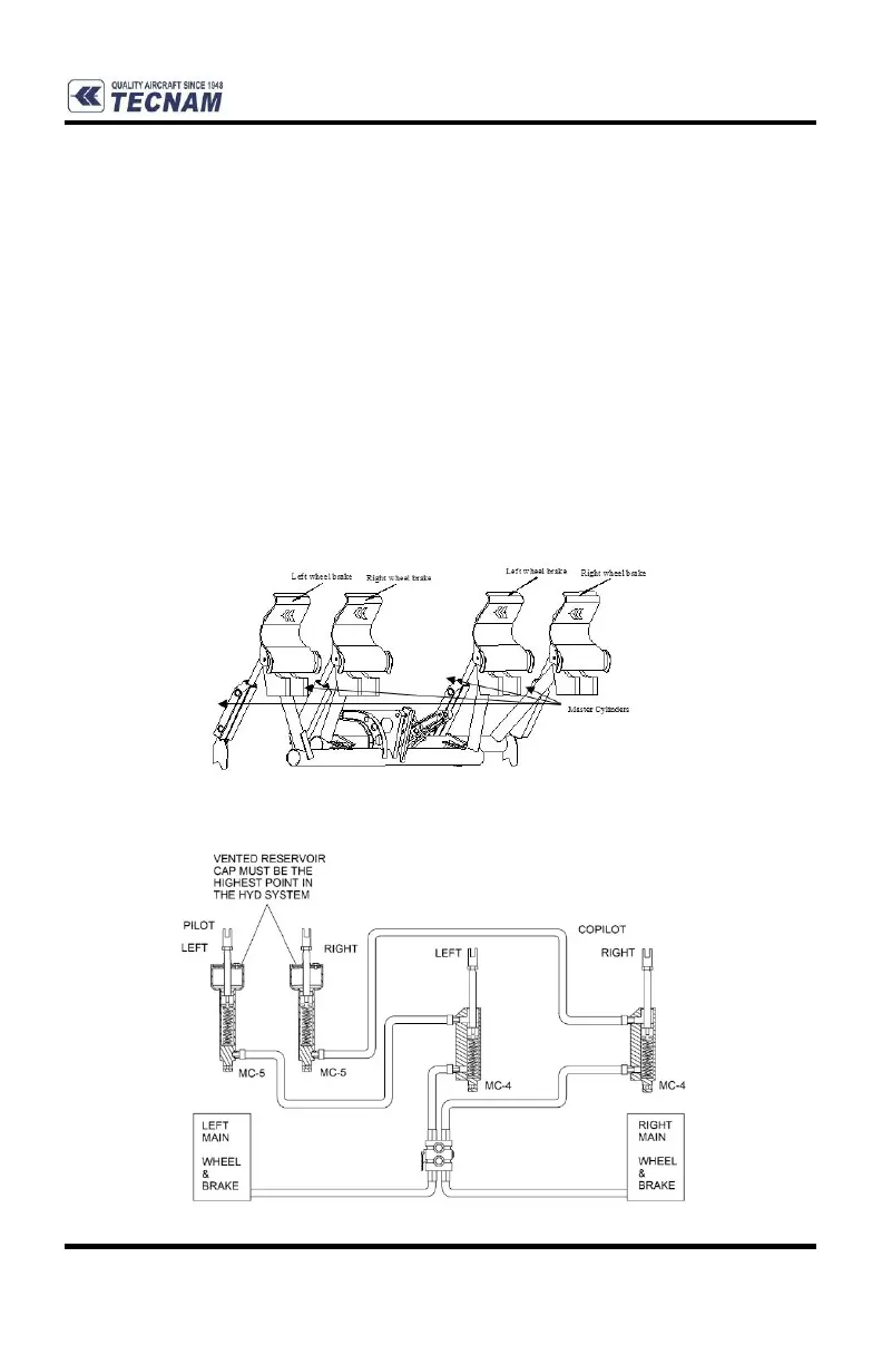 each main wheel. A master cylinder is attached to each pilot’s rudder pedal.