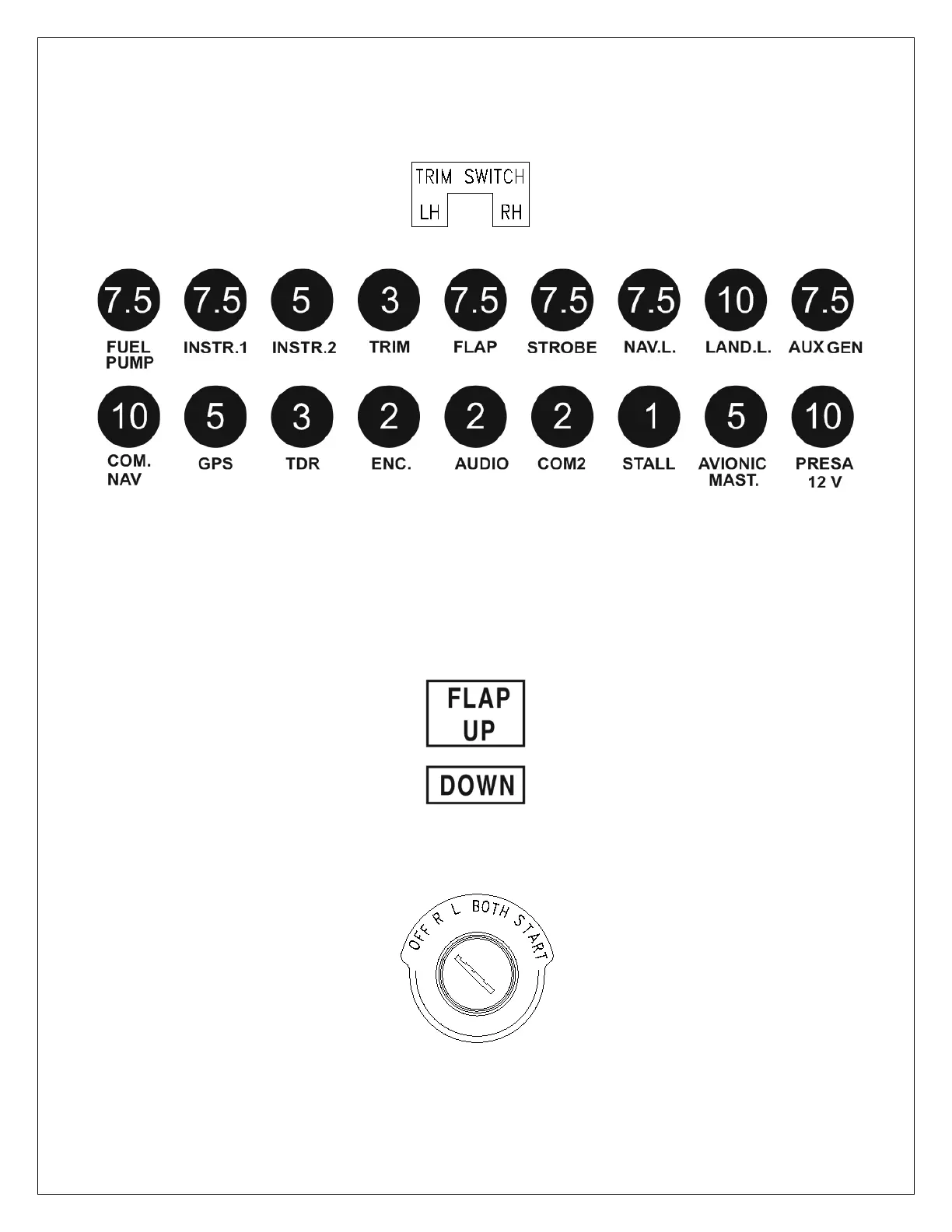 ‘The flap control switch is located on the lower portion of the instrument panel. The following placards (15x10mm the