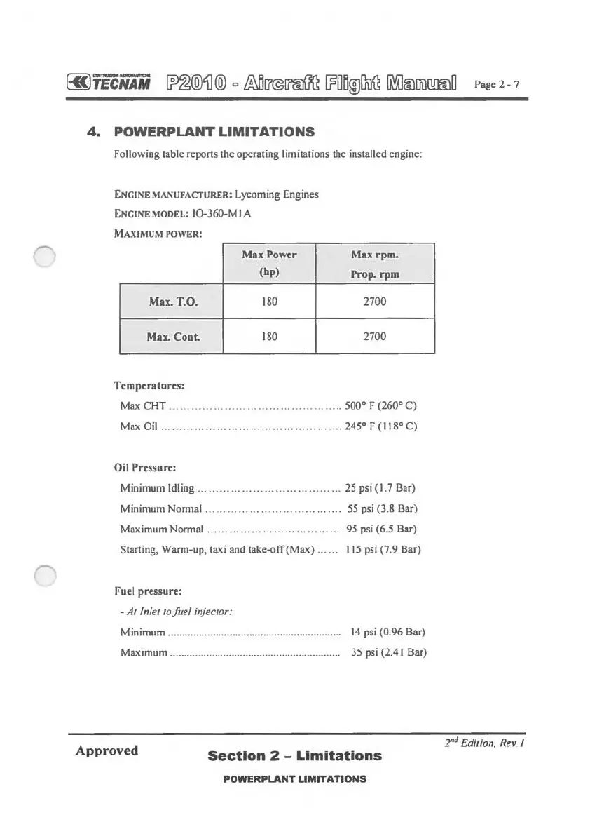 Following table reports the operating limitations the installed engine: