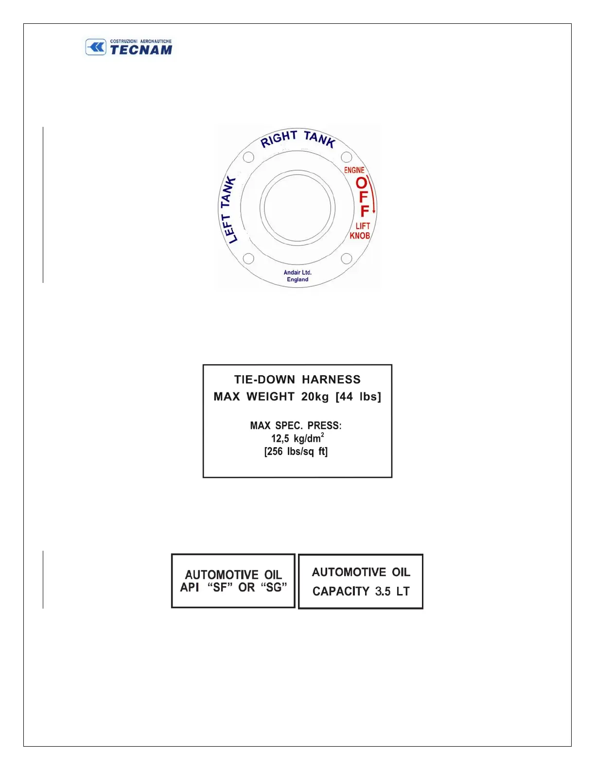 The oil tank reservoir is equipped with the following two placards indicating the type and quantity of engine’s oil stored