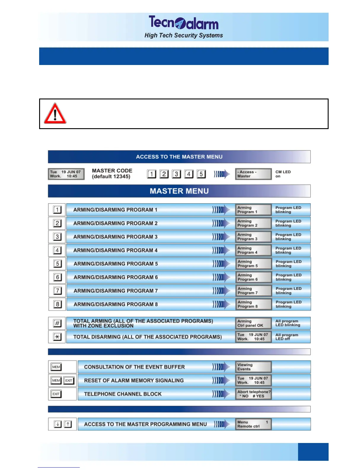 If the control panel is armed, the installer will not be able to execute any programming (installer/master