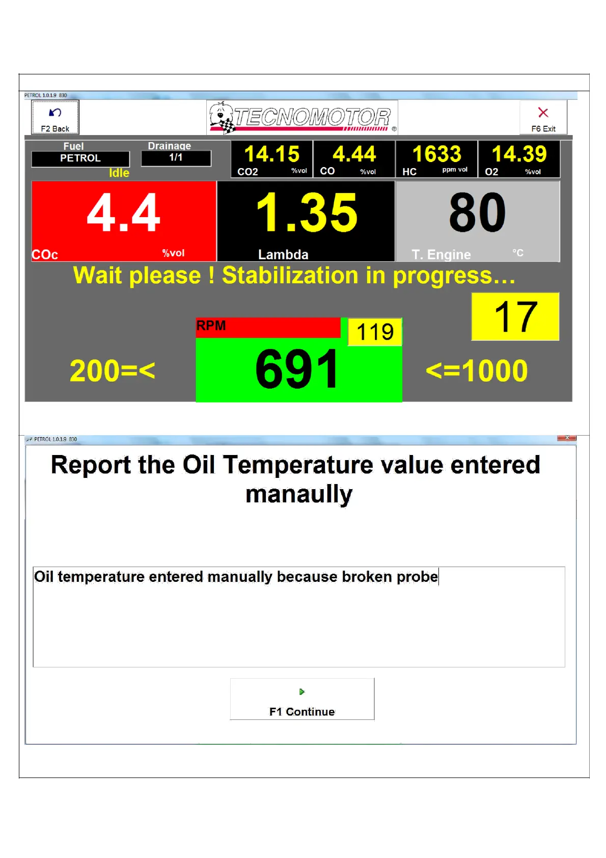 Wait for the stabilisation to be completed and for and the exhaust gas analysis to end.