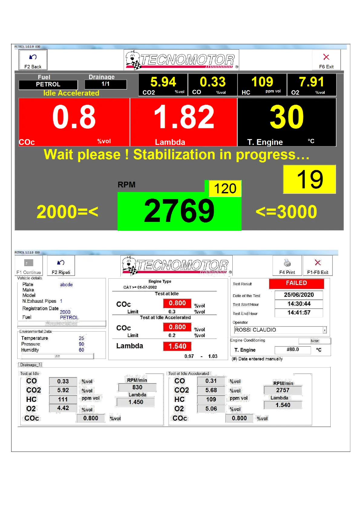 Wait for the stabilisation to be completed and for and the exhaust gas analysis to end.