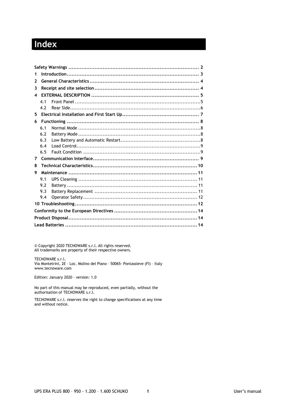 UPS ERA PLUS 800 – 950 - 1.200 – 1.600 SCHUKO 1 User’s manual