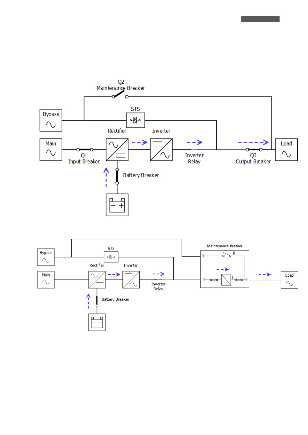Figure 4.4 – Battery Mode Diagram (up: 80KVA~210KVA cabinet; down: only 300KVA cabinet)