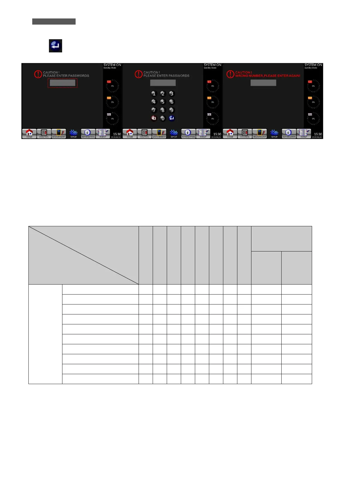 select icon to enter SETUP Submenus. If incorrect password is entered, the LCD screen will ask for retry.