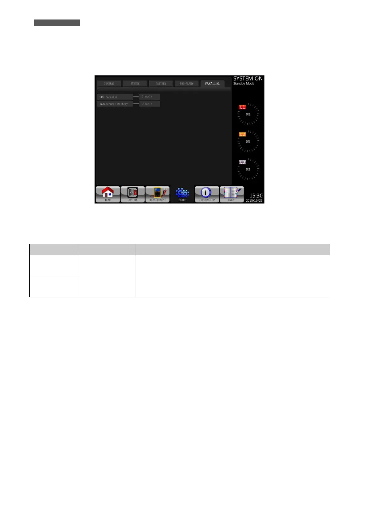 Please check Table 5-11 “SETUP-PARALLEL Setting List” for the details.