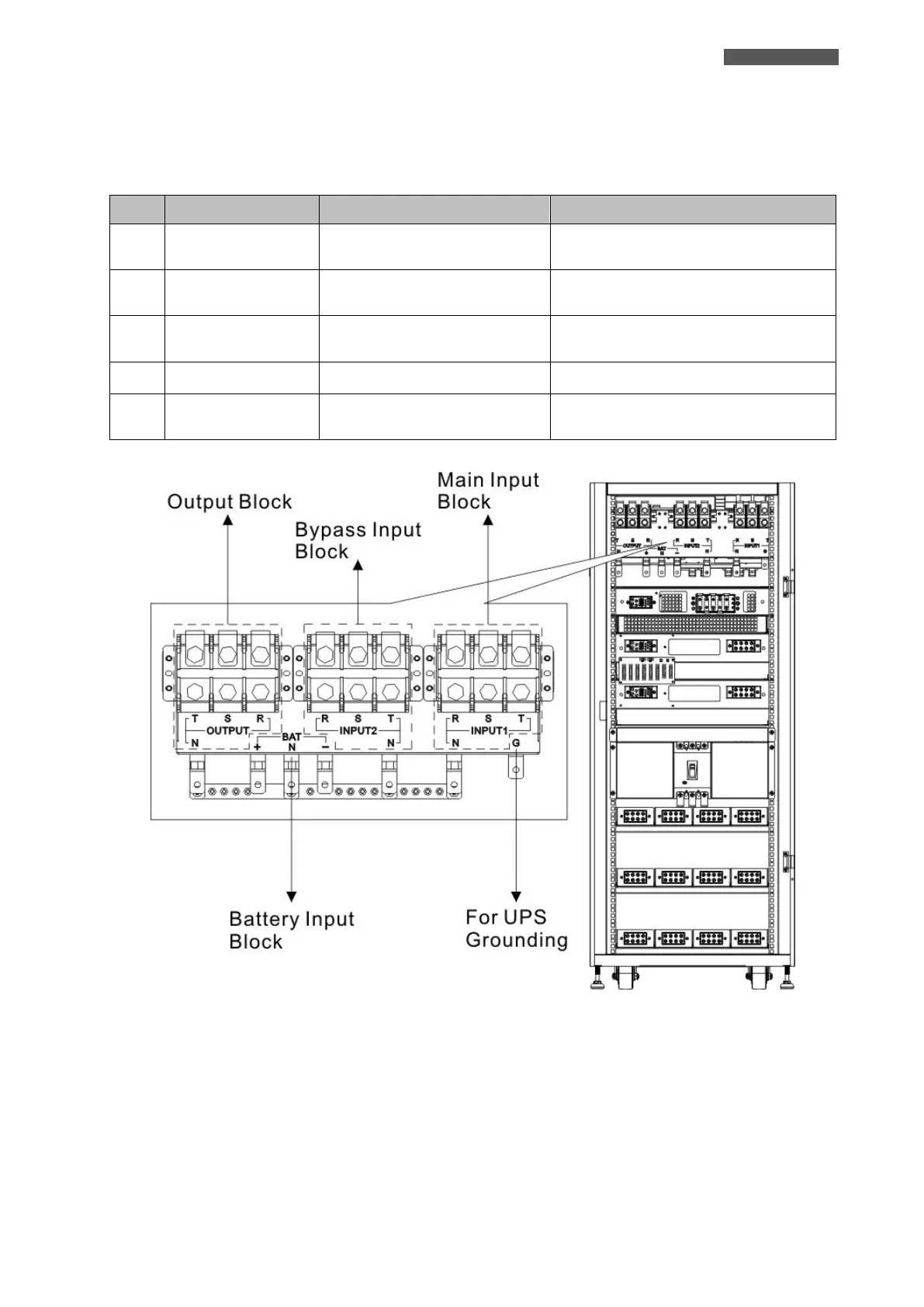 After opening the rear door, you will see the Wiring Terminal Blocks. For UPS cabinet wiring, please refer to