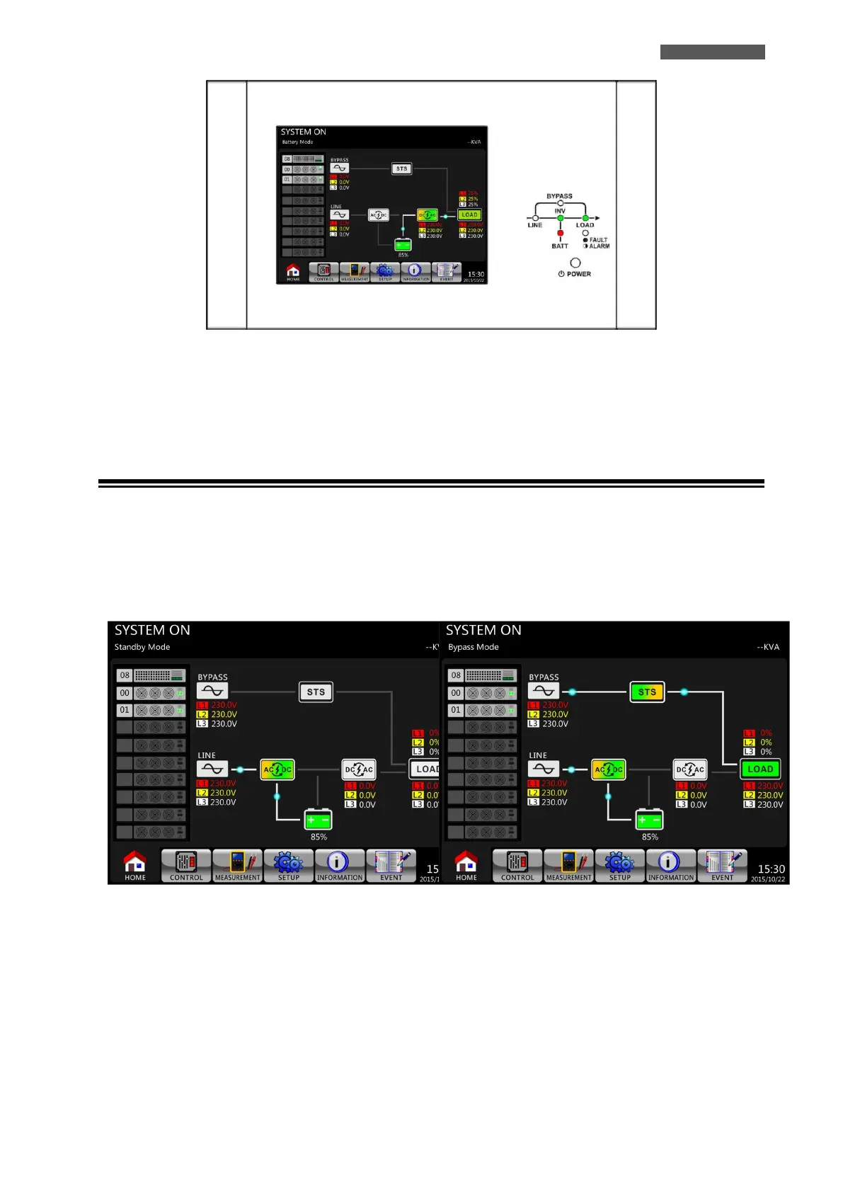 The UPS can operate in Standby Mode or Bypass Mode, depending on the Bypass Mode Setting. The LCD diagrams