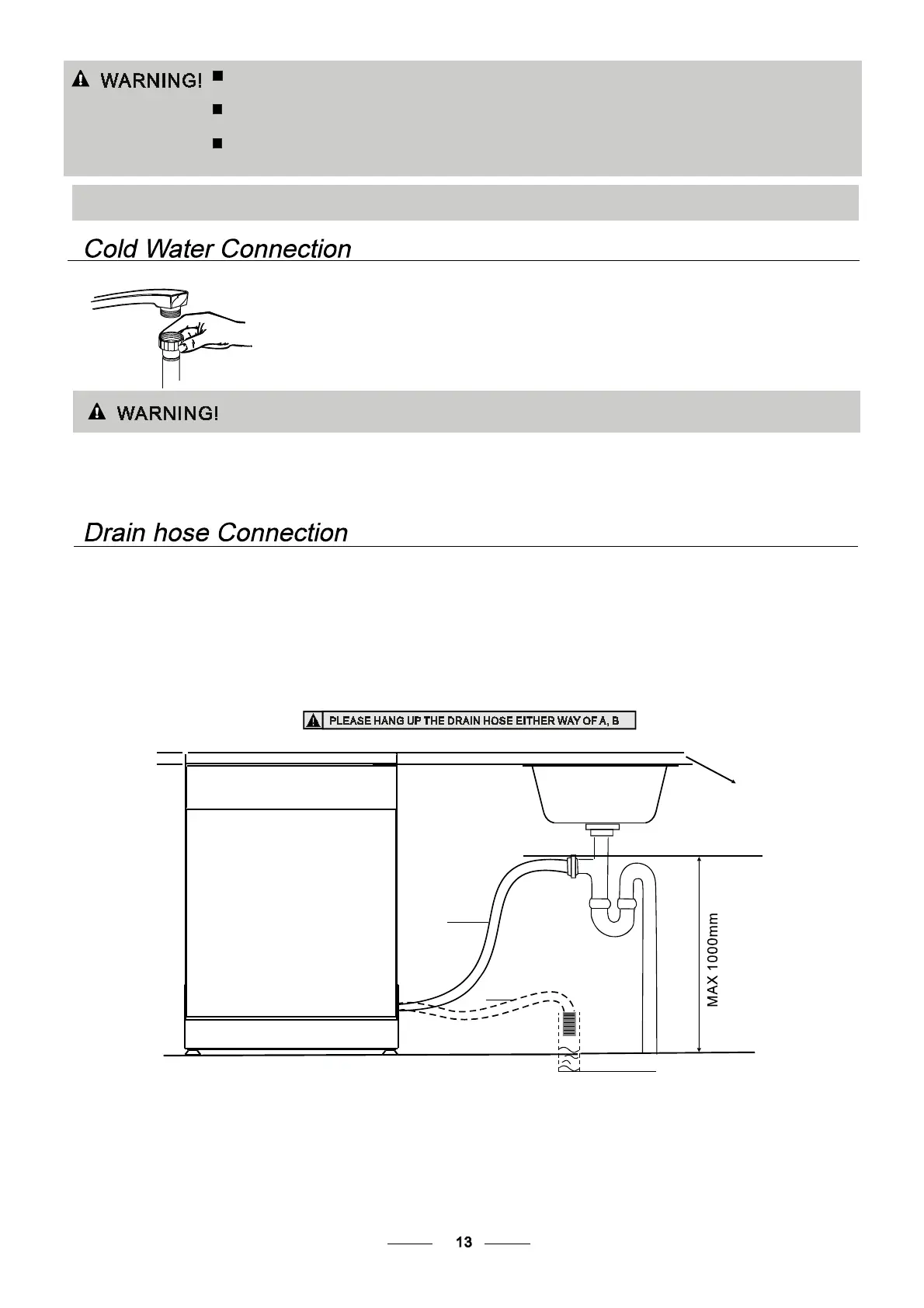 Insert the drain hose into a drain pipe with a minimum diameter of 40mm, or let it run into the sink, making sure to