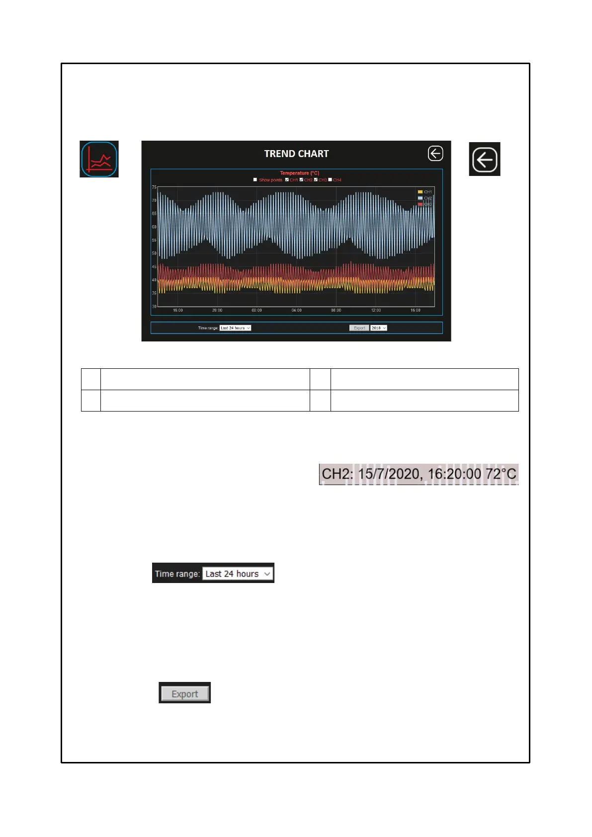 The trend chart screen allows the user to view the temperature trends of the enabled channels CH1-CH2-CH3-CH4, and it