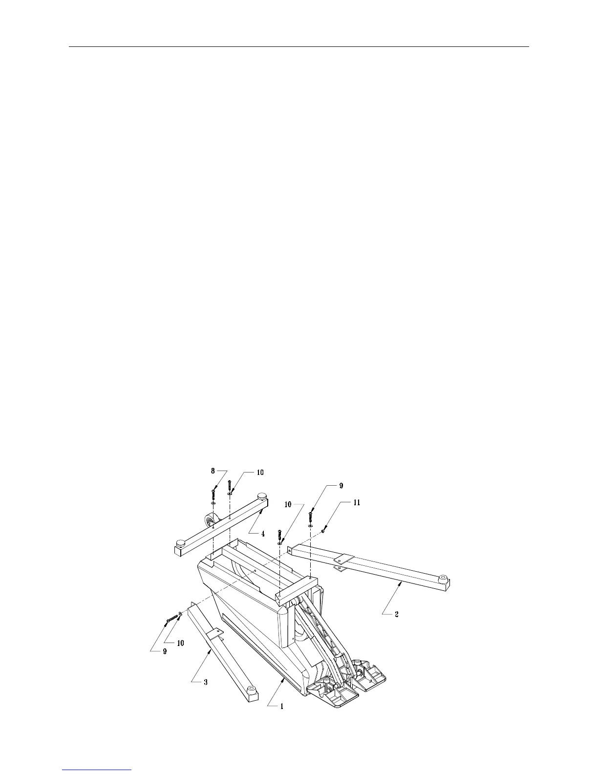 5/16” by 2.25” screws (9) and washers (10), and one 5/16” nut (11). Attach the front foot using
