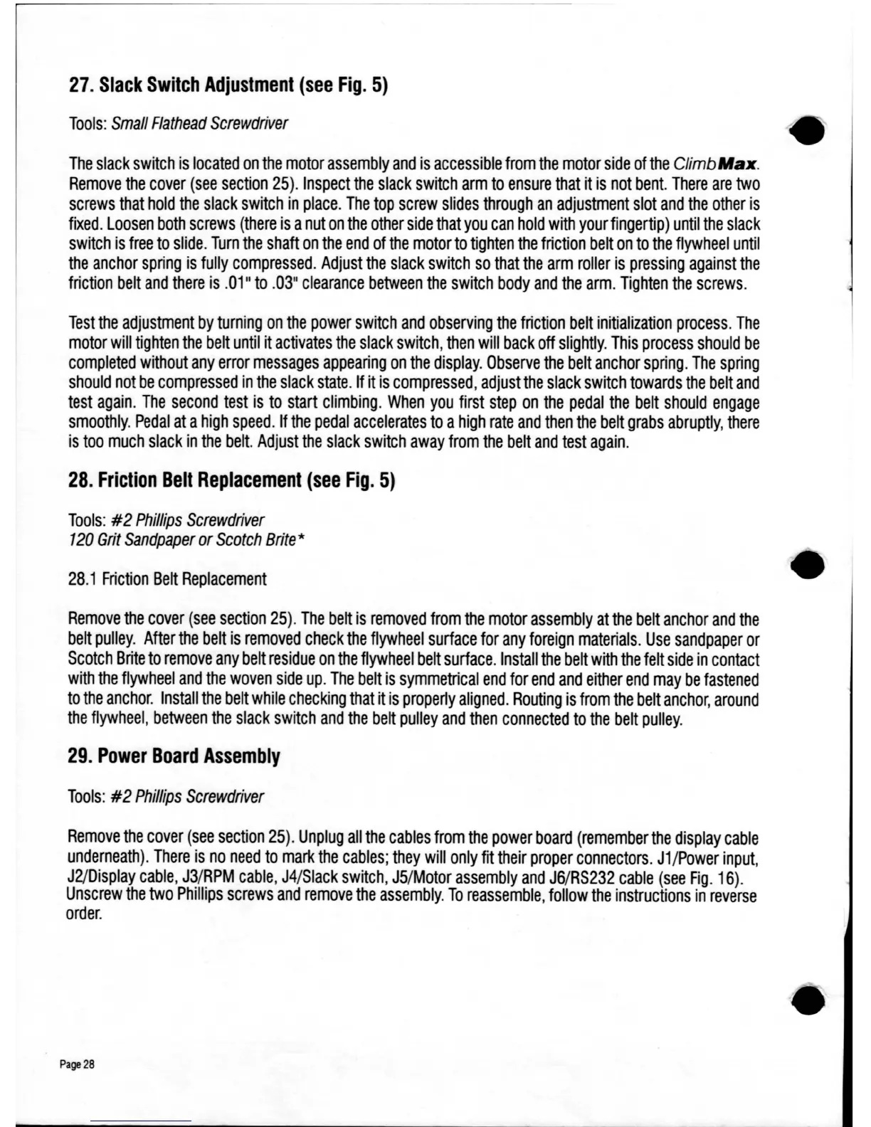 Tectrix Climbmax 150 - Slack Switch Adjustment; Friction Belt Replacement; Power Board Assembly