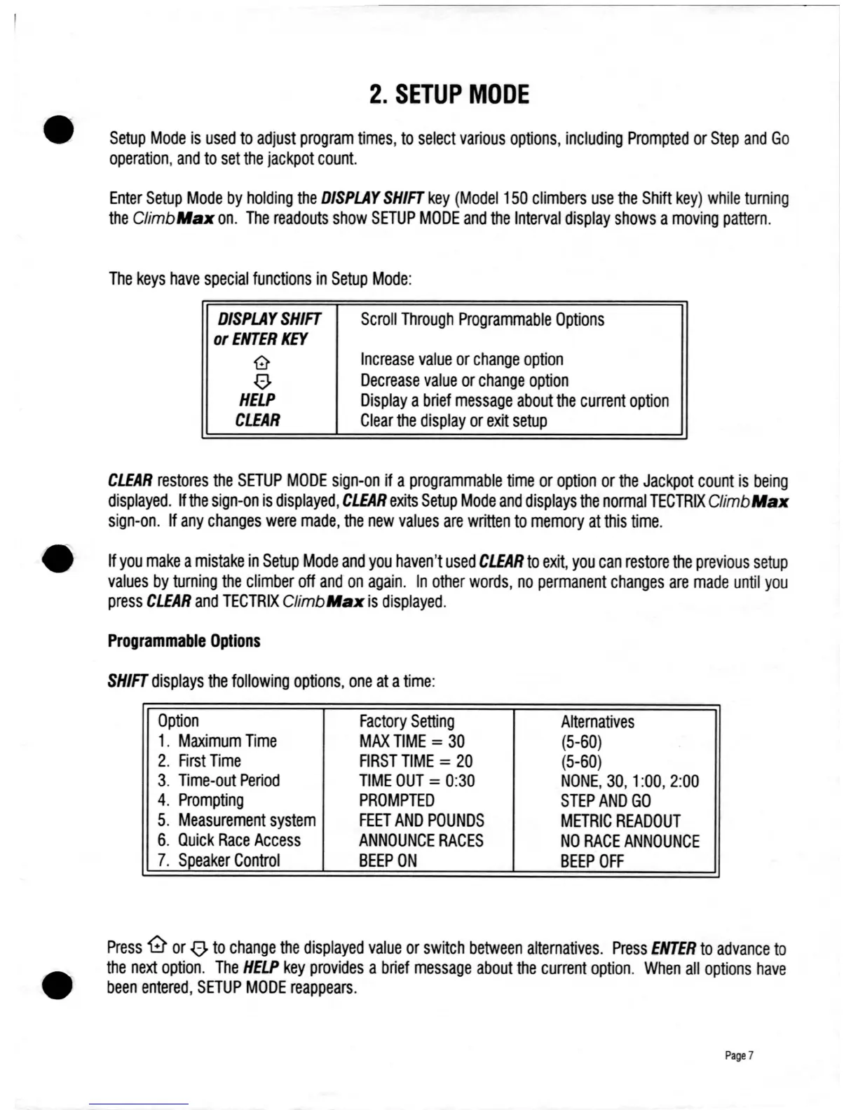 Tectrix Climbmax 150 - Setup Mode; Programmable Options and Settings