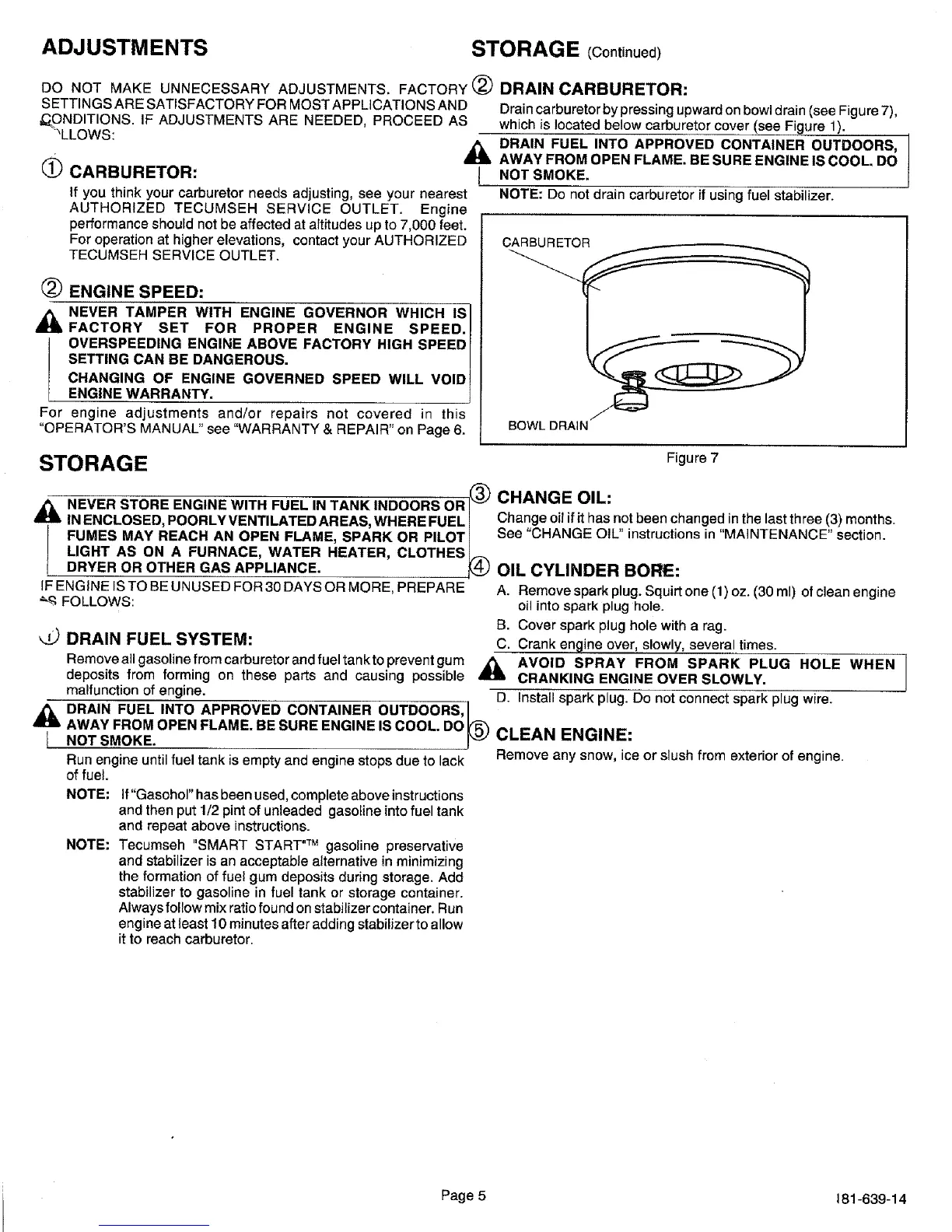 NEVER STORE ENGINE WITH FUEL IN TANK INDOORS OR _ CHANGE OIL: