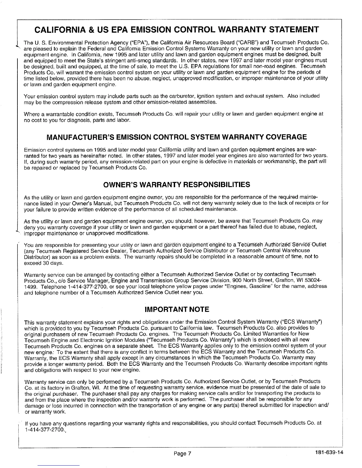 Tecumseh Products Co. engines on a separate sheet. The ECS Warranty applies only to the emission control system of your