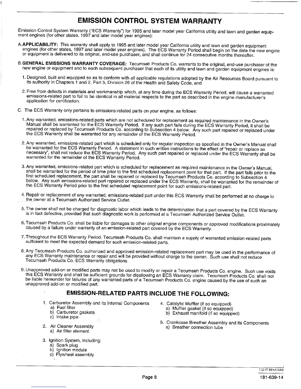 B.GENERAL EMISSIONS WARRANTY COVERAGE: Tecumseh Products Co. warrants to the original, end-use purchaser of the
