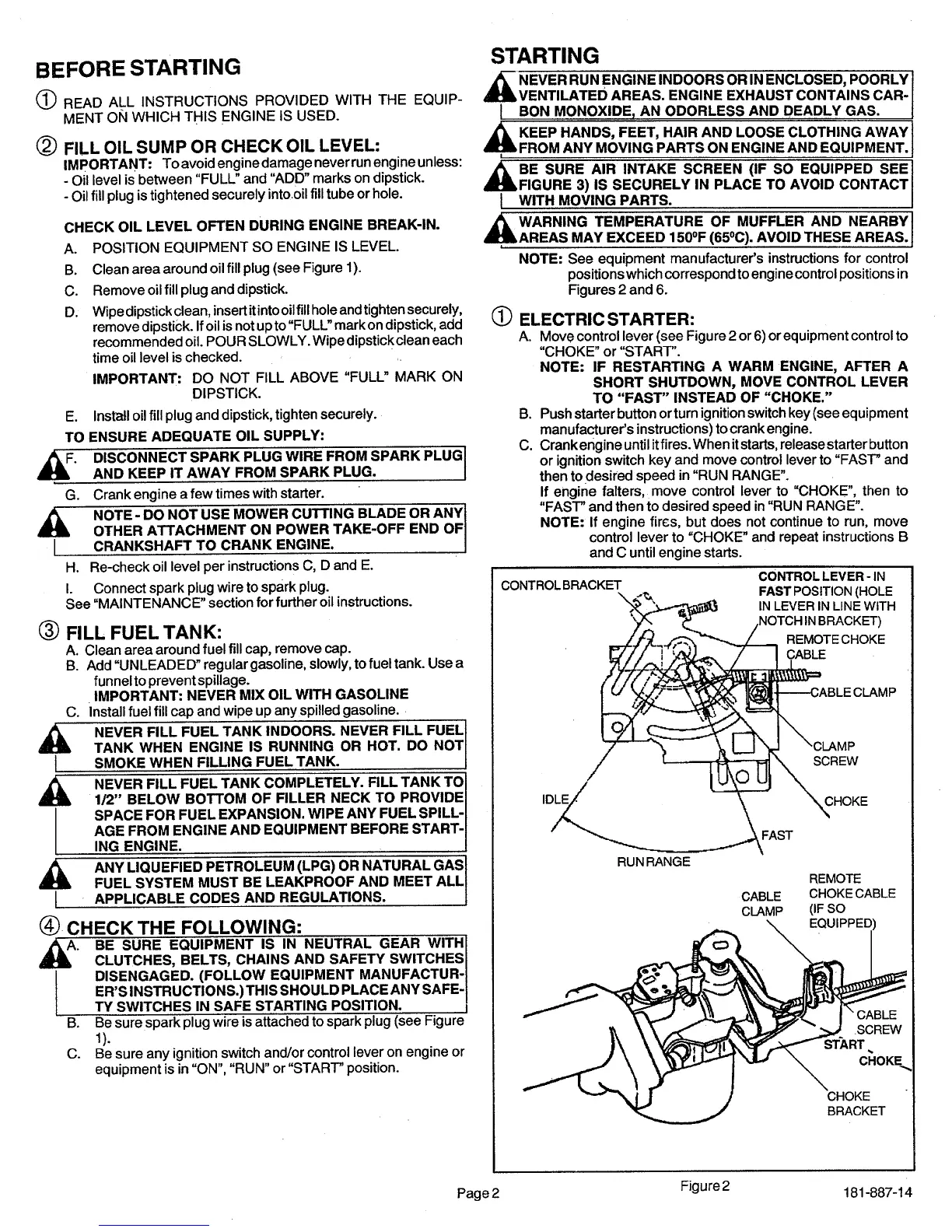 Tecumseh OHV135 - Before Starting Procedures; Check and Fill Oil Level; Engine Starting Methods; Electric Starter Operation