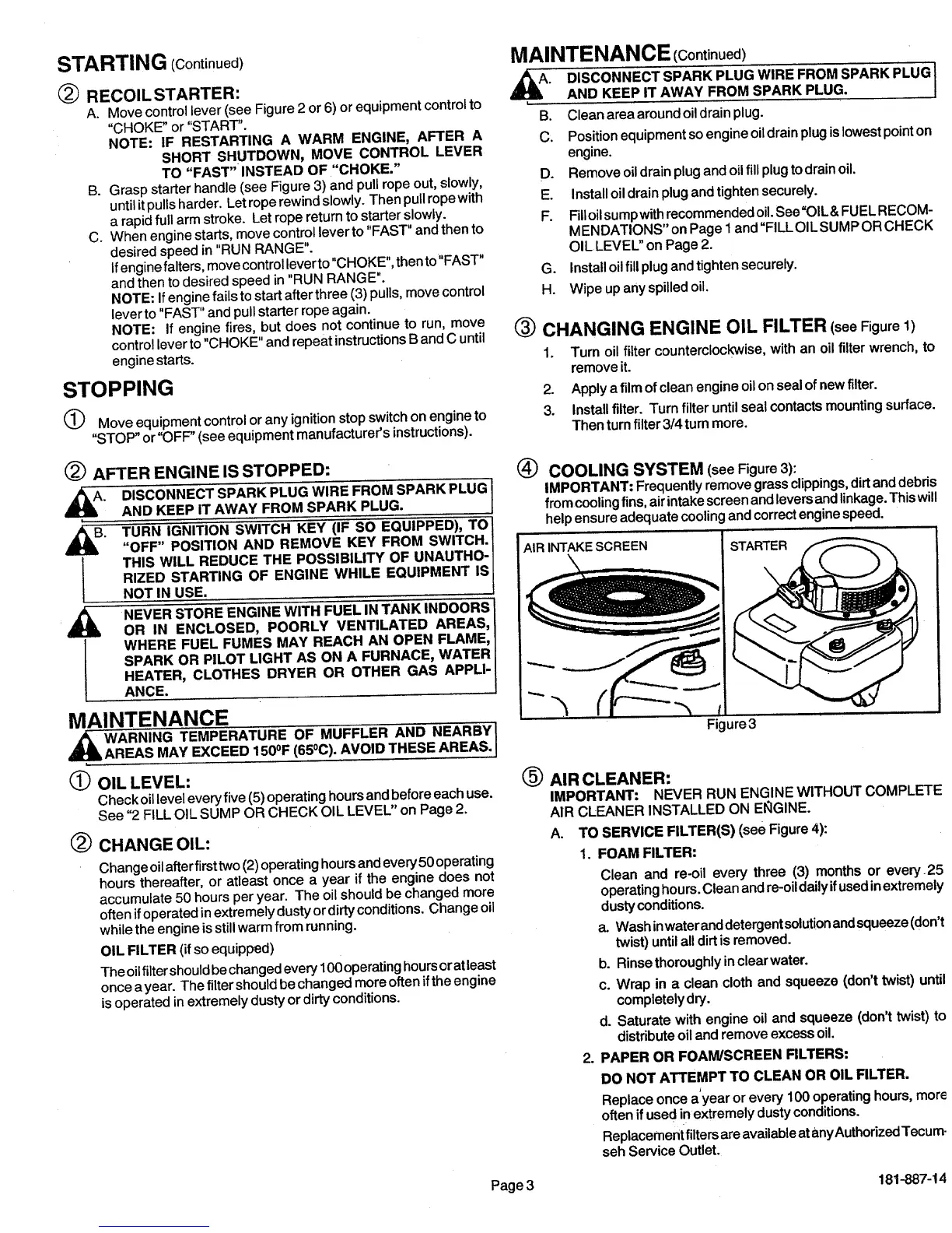Tecumseh OHV135 - Starting and Stopping; Recoil Starter Operation; Routine Maintenance Tasks; Checking Oil Level