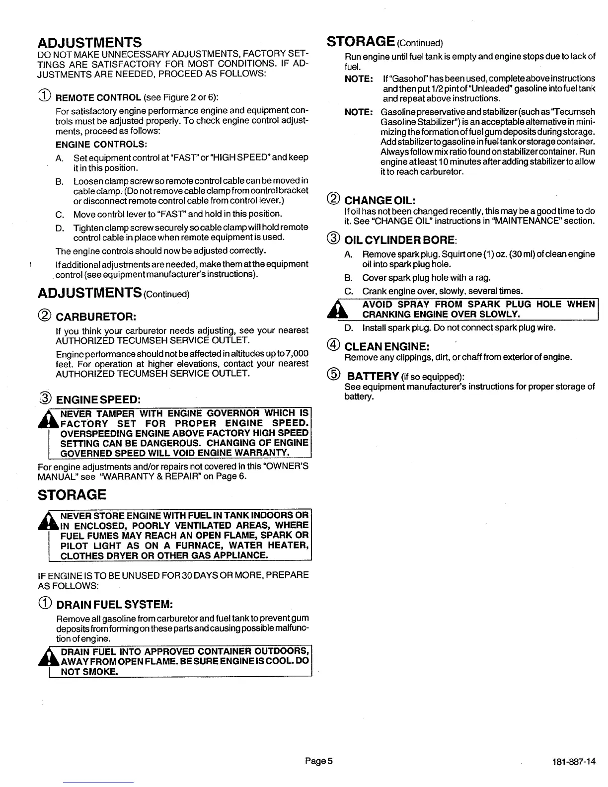 Tecumseh OHV135 - Engine Storage Preparation; Fuel System Draining; Storage Procedures