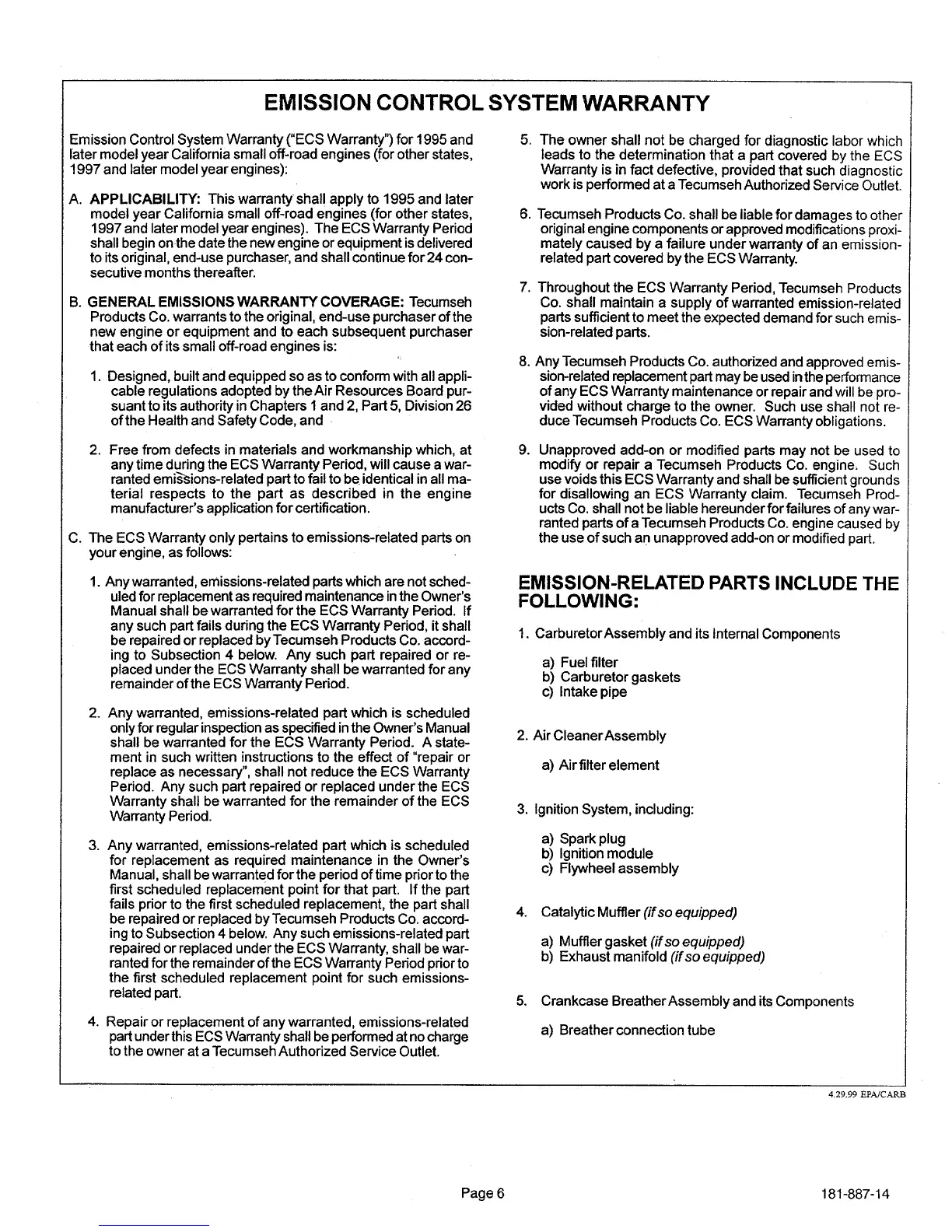 Tecumseh OHV135 - Emission Control System Warranty; Warranty Applicability and Coverage; Emissions-Related Parts
