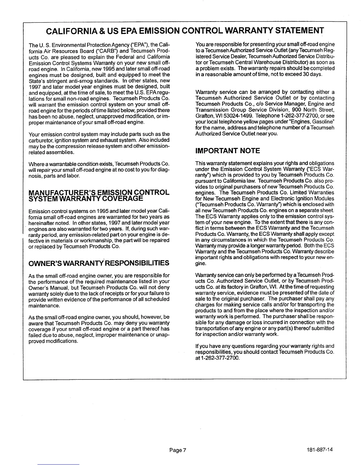 Tecumseh OHV135 - Warranty Statement Details; Emission Control System Warranty; Owners Responsibilities