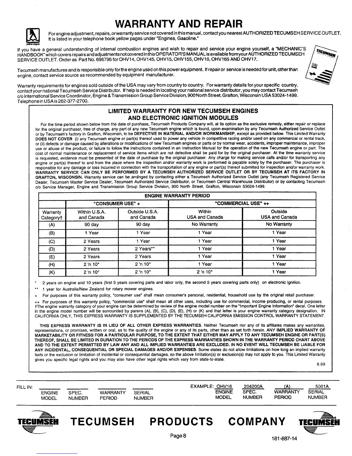 Tecumseh OHV135 - Warranty and Repair Services; Limited Warranty Overview