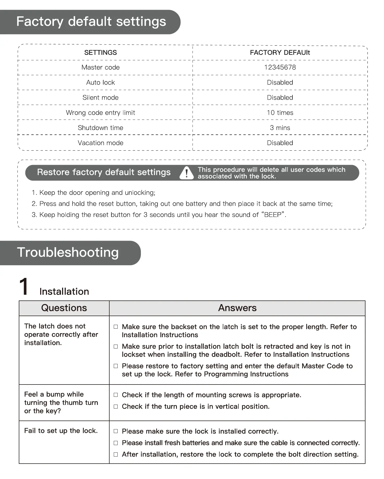Please make sure the lock is installed correctly.