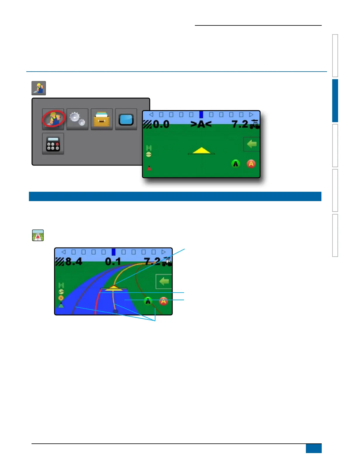 Two guidance screens, vehicle view and eld view, assist in keeping the user informed. From the vehicle view screen, guidance