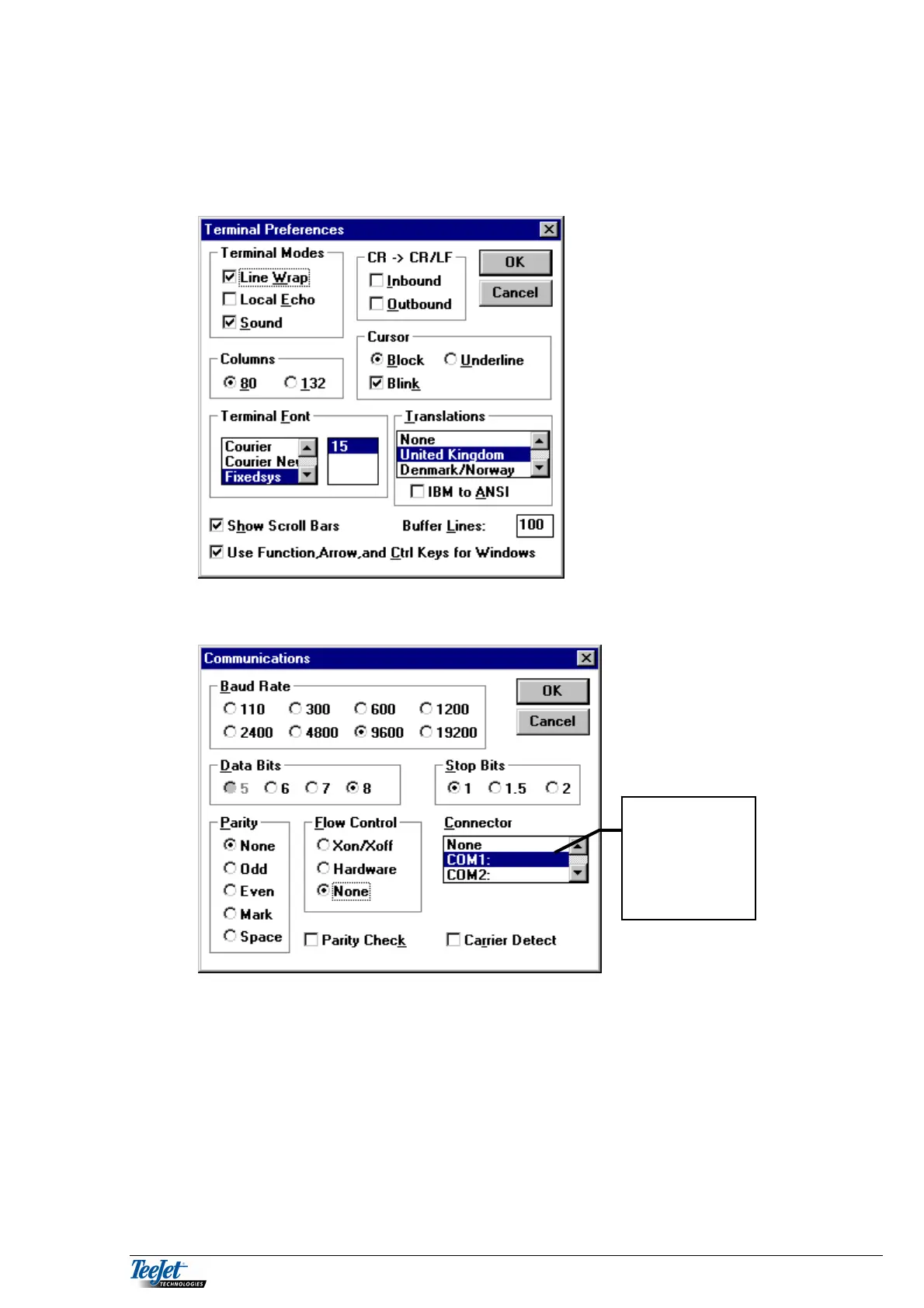 Figure 2. Screen shot of settings/communications set-up. (Windows Terminal)