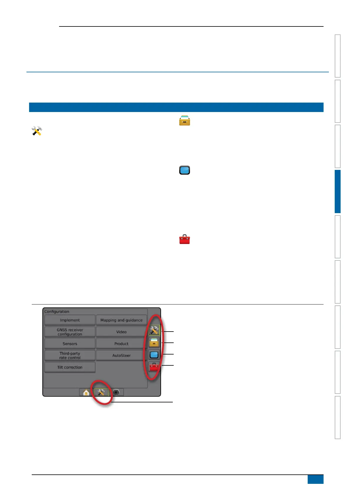 System Setup is used to congure the console, the machine and its implements. Four side tabs access options for Machine/Implement