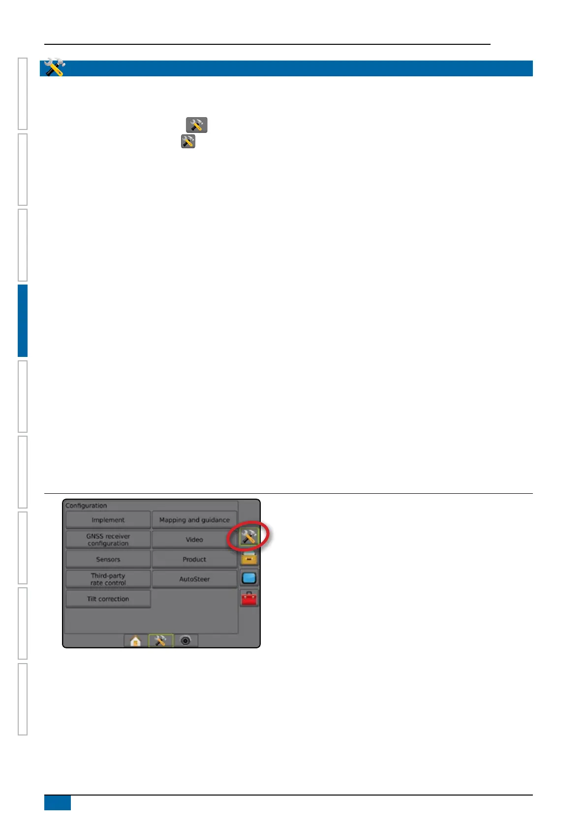 Conguration is used to congure the system components including implements, guides, steering, monitors and sensors.