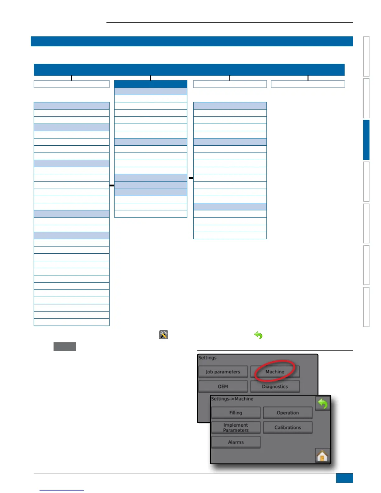 Machine congures machine settings. Options include Filling, Operation, Implement Parameters, Calibrations and Alarms.