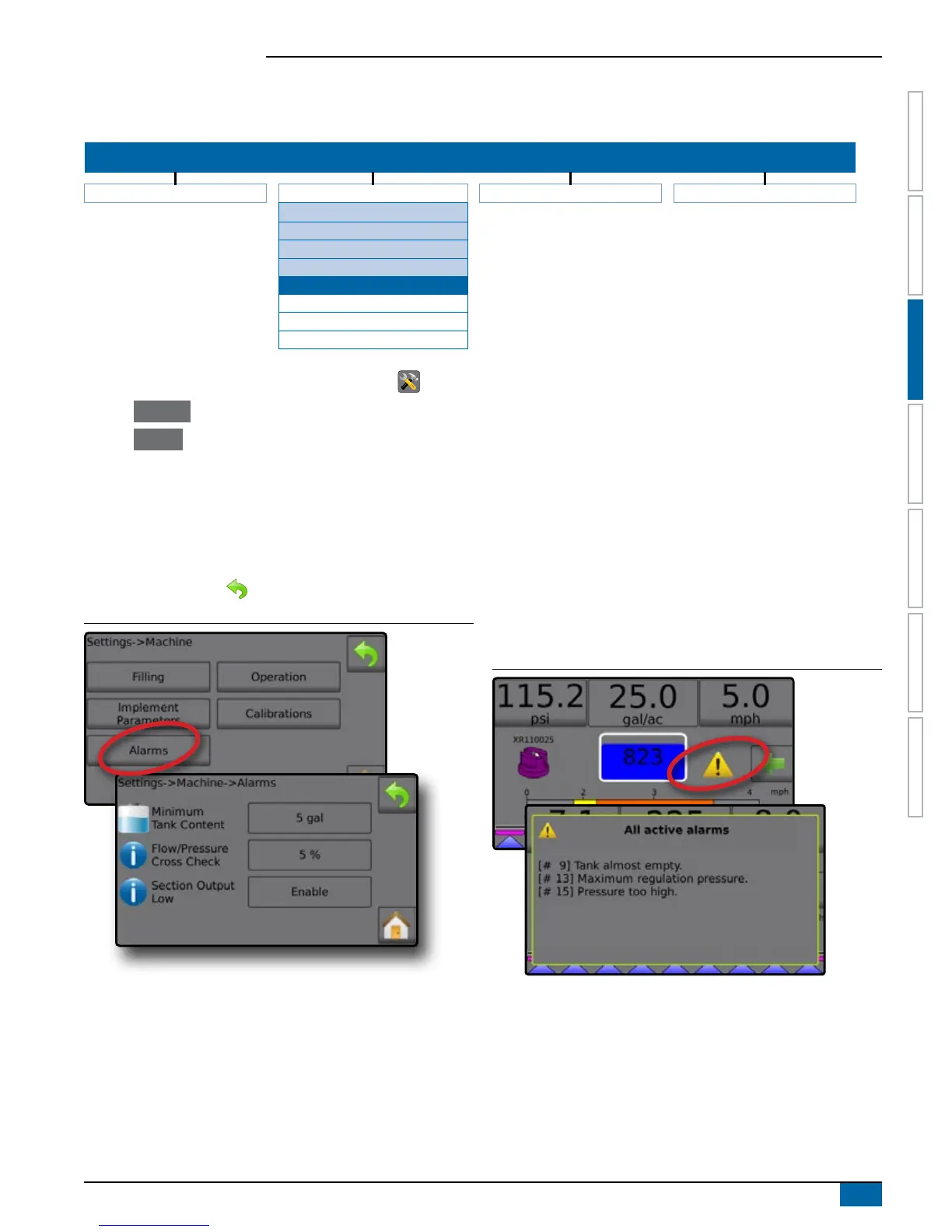 Alarms establishes alarms as on/off, or sets their trigger level.