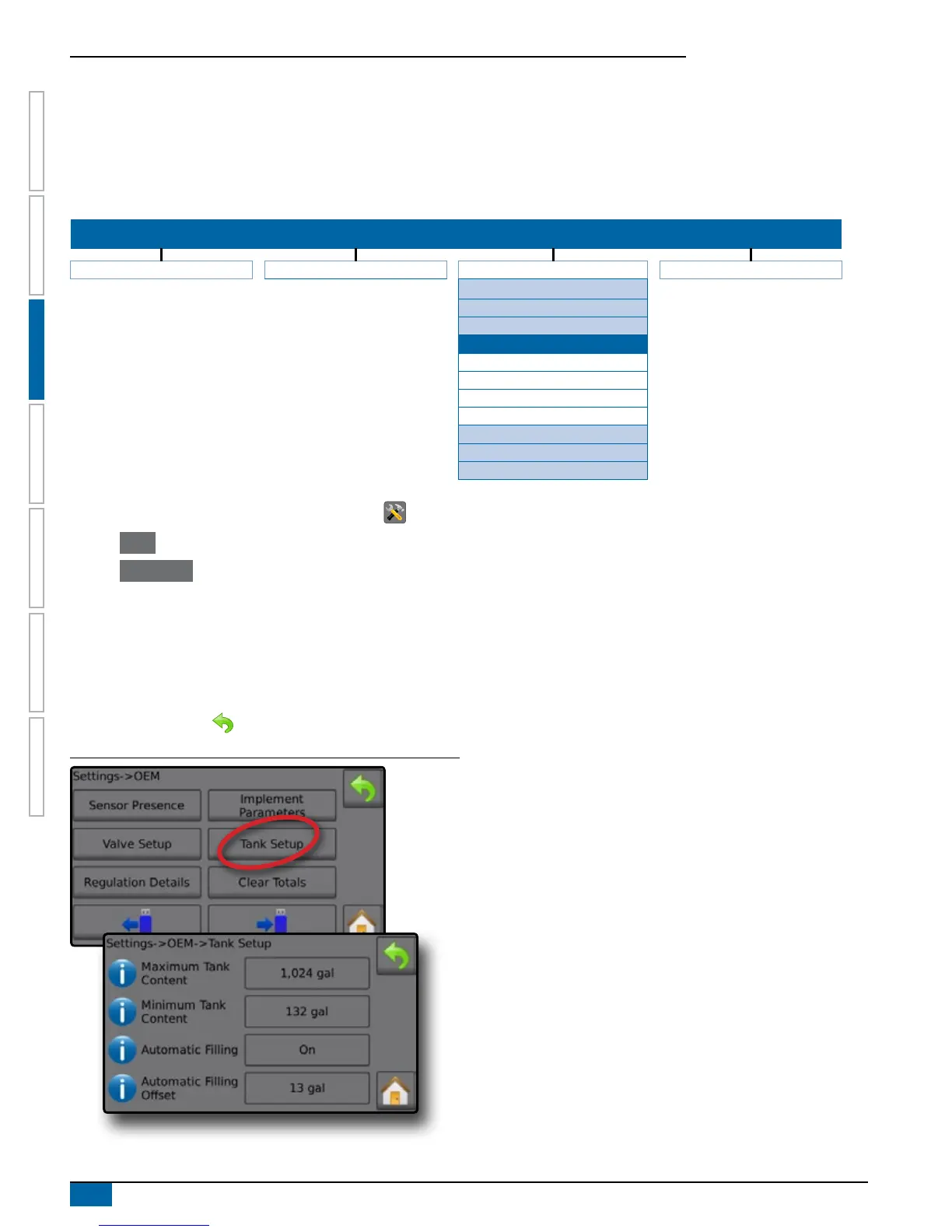 Tank Setup establishes the maximum and minimum tank content, Automatic Flling mode and Automatic Filling Offset value.