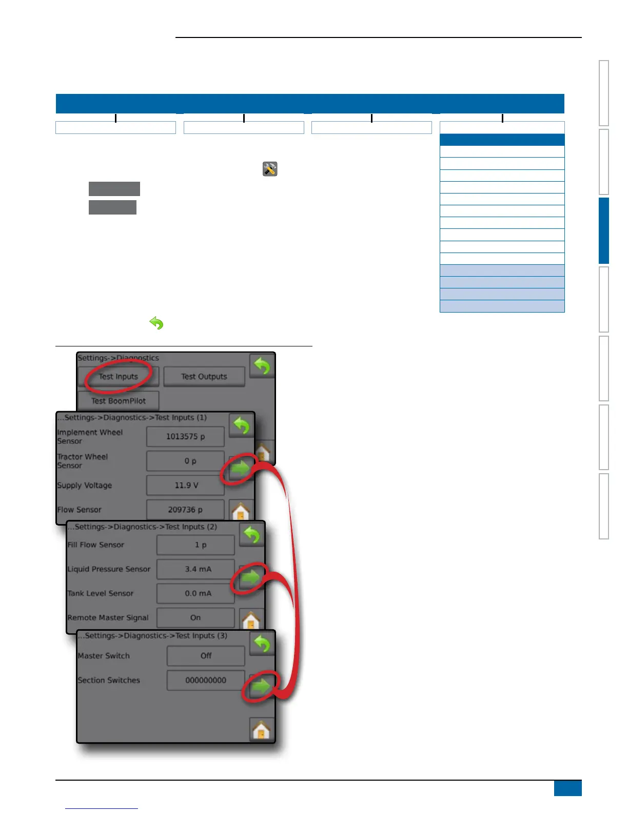 Test Inputs displays the input high and low values on the installed sensors. To reset all Test Input pulse counts to zero (0), press pulse value.